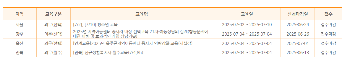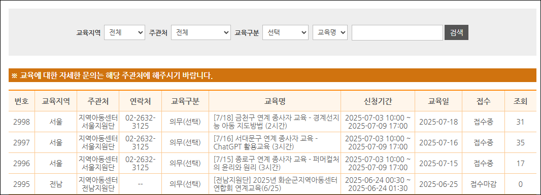 - 지역별 / 교육구분별 / 신청기간별 - 교육명, 일정, 주관처, 연락처 등 상세정보도 함께 제공됩니다.