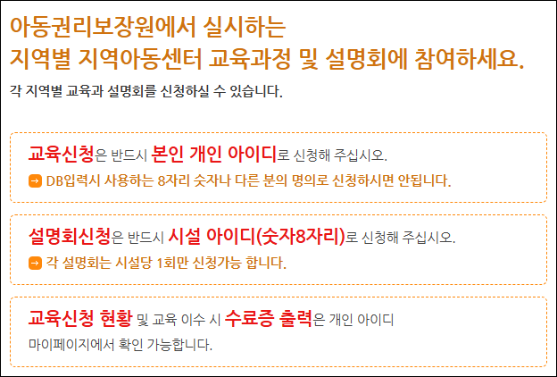 - 설명회 신청은 센터의 시설 아이디(8자리 숫자)로 로그인해야 하며,